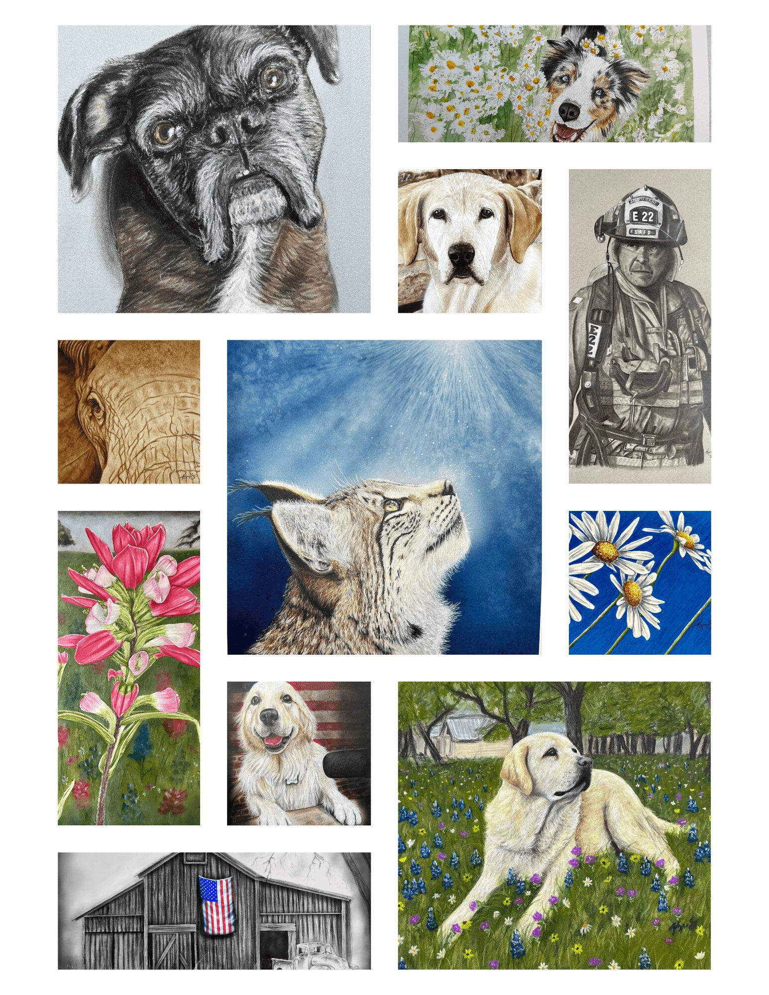 I specialize in realistic and detailed artwork, often blending different mediums to get the exact look and feel I want. I’m best known for my pet portraits, flowers, and my South Texas-inspired pieces — a mix of animals, flowers, and landscapes that reflect the beauty of where I’m from. I love capturing the small details that make something feel real, whether it’s the shine in a dog’s eyes or the texture of a weathered barn.