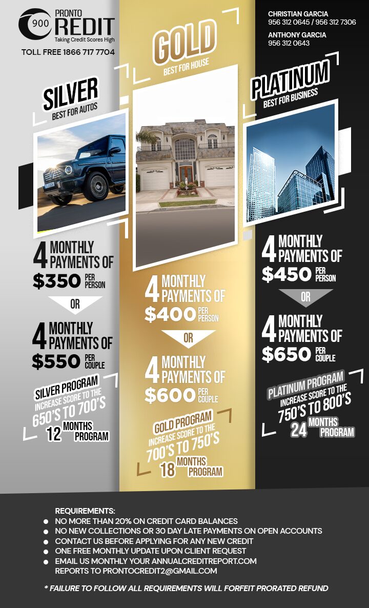 - Gold Program 4 monthly payments of $400 to increase credit score to the 700’s to 750’s